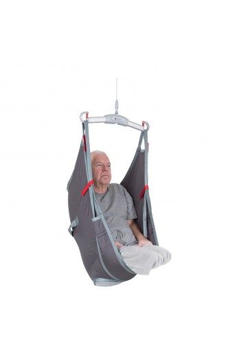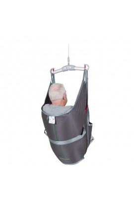 Arnés de amputados, espalda media AmpSling está diseñado para usar en las situaciones de elevación más comunes, como por ejemplo en las transferencias en posición sentada entre la cama y la silla de ruedas, incluso cuando un arnés sin soportes de piernas divididos fuese preferible, por ejemplo, al levantar un usuario con doble amputación alta de las piernas.