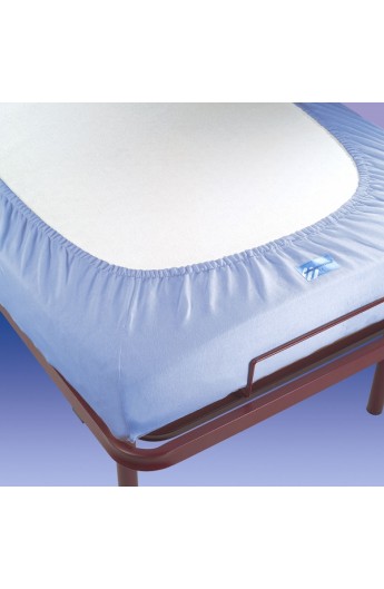 Funda reutilizable diseñada para la protección de colchones, fabricada con tejido técnico 100% poliéster con recubrimiento de poliuretano, de color azul celeste, impermeable, transpirable, ignífuga, antibacteriana y fungicida (ABF).