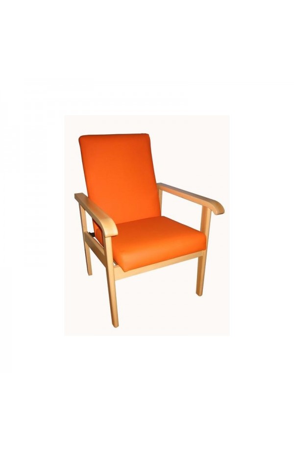 Sillón geriátrico de respaldo medio, su estructura de madera maciza de haya. Gruesos de madera 70 mm y 38 mm. Referencia 7017.0